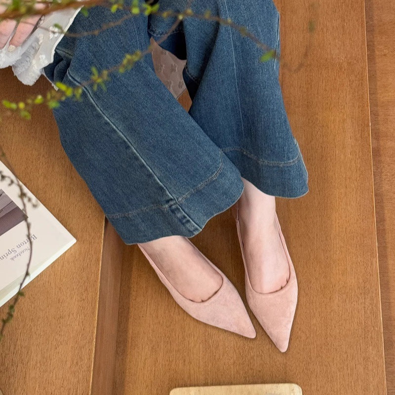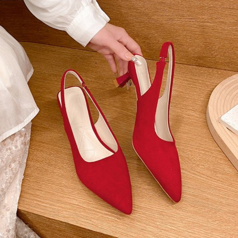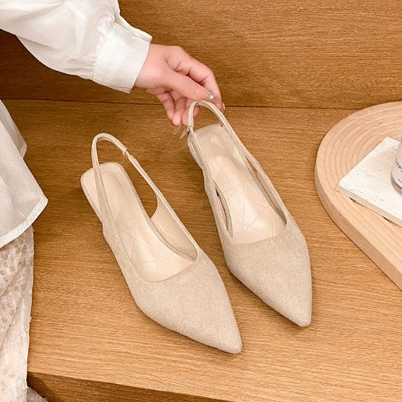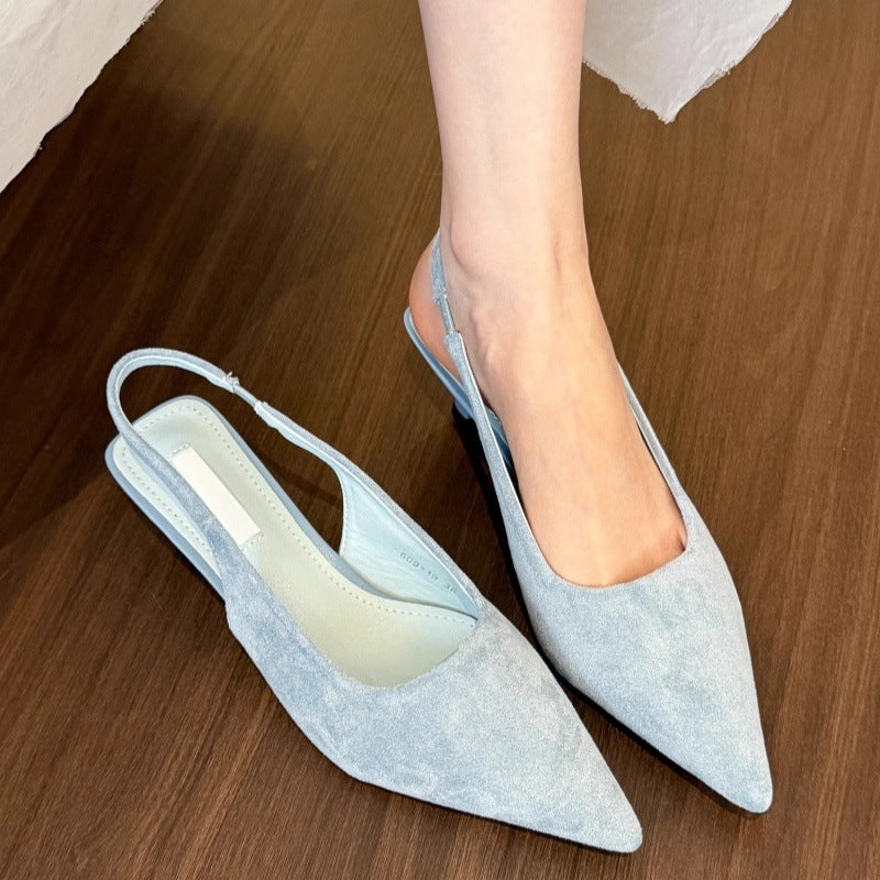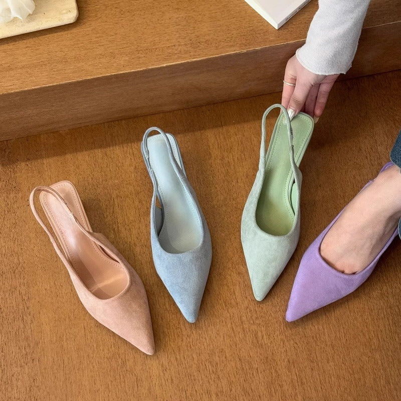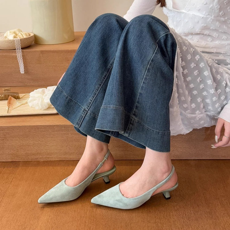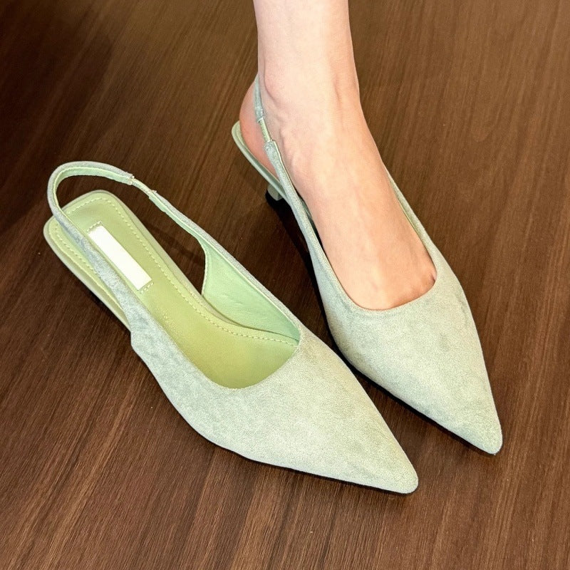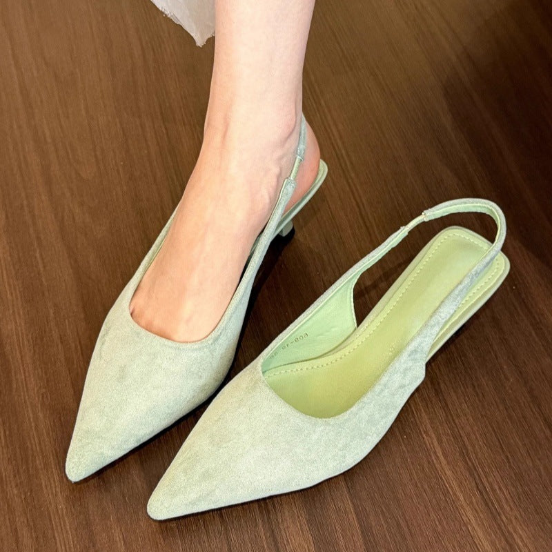 沉溺春日!仙草绿尖头高跟鞋女2025春季新款百搭后空绒面后空凉鞋