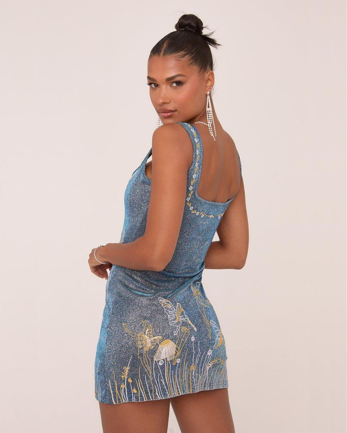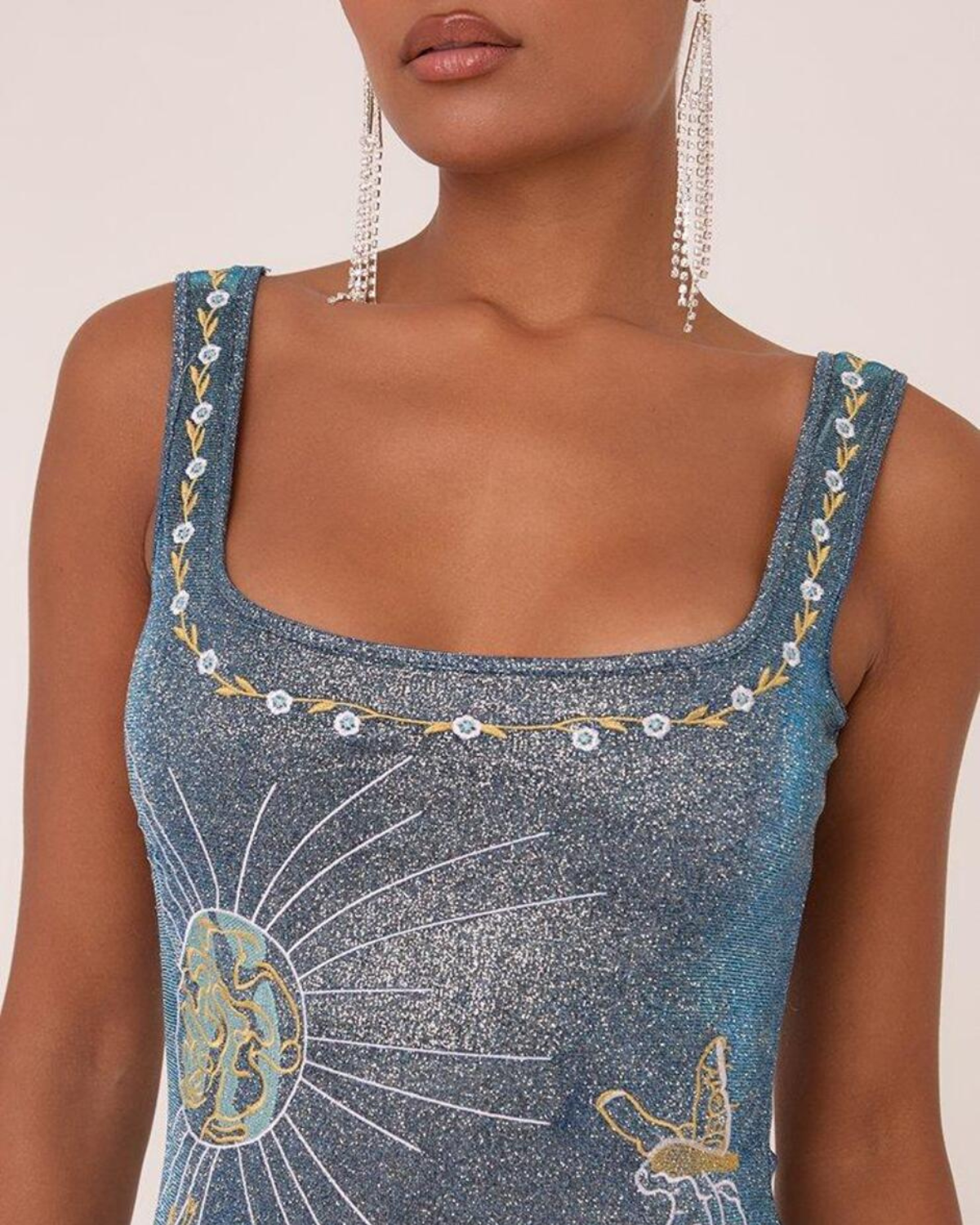 Designed to dazzle, this show-stopping mini contours your silhouette with a body-hugging embellished fabric that glistens with every step. The square neckline frames the décolletage with clean elegance, while the jewel-adorned straps add a luxurious touch. A daring thigh-high slit adds allure, perfectly balancing sophistication with sensuality. Finished with celestial-inspired embroidery and intricate detailing, ‘Celestia’ is your go-to for glamorous nights where all eyes are on you.