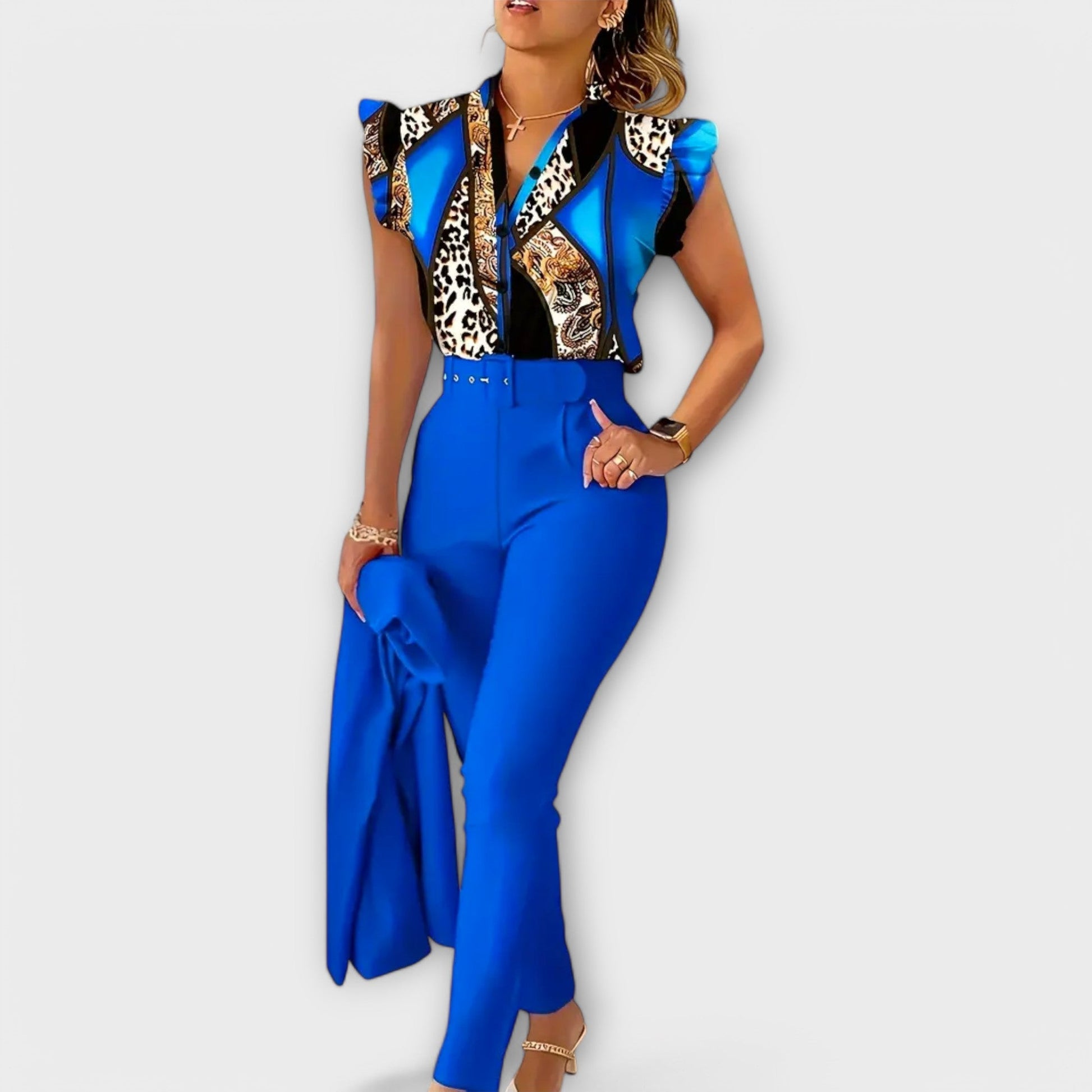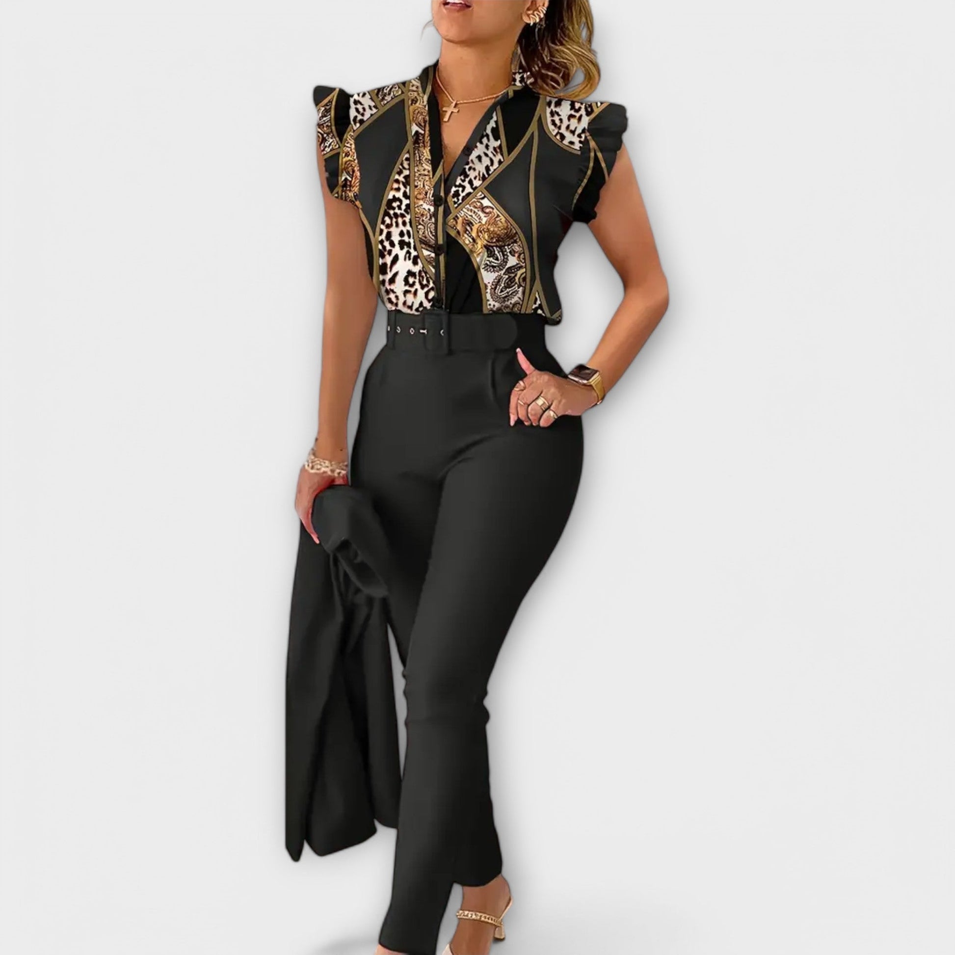 Make an impression with this stylish two-piece set, which combines a striking leopard print on the top with an elegant, solid-colored bottom. The top features ruffled sleeves for a feminine and playful expression, while the slim pants come with a matching belt that highlights your waist and completes the sophisticated look. This set is ideal for everything from the office and business meetings to festive occasions where you want to shine with both confidence and style.