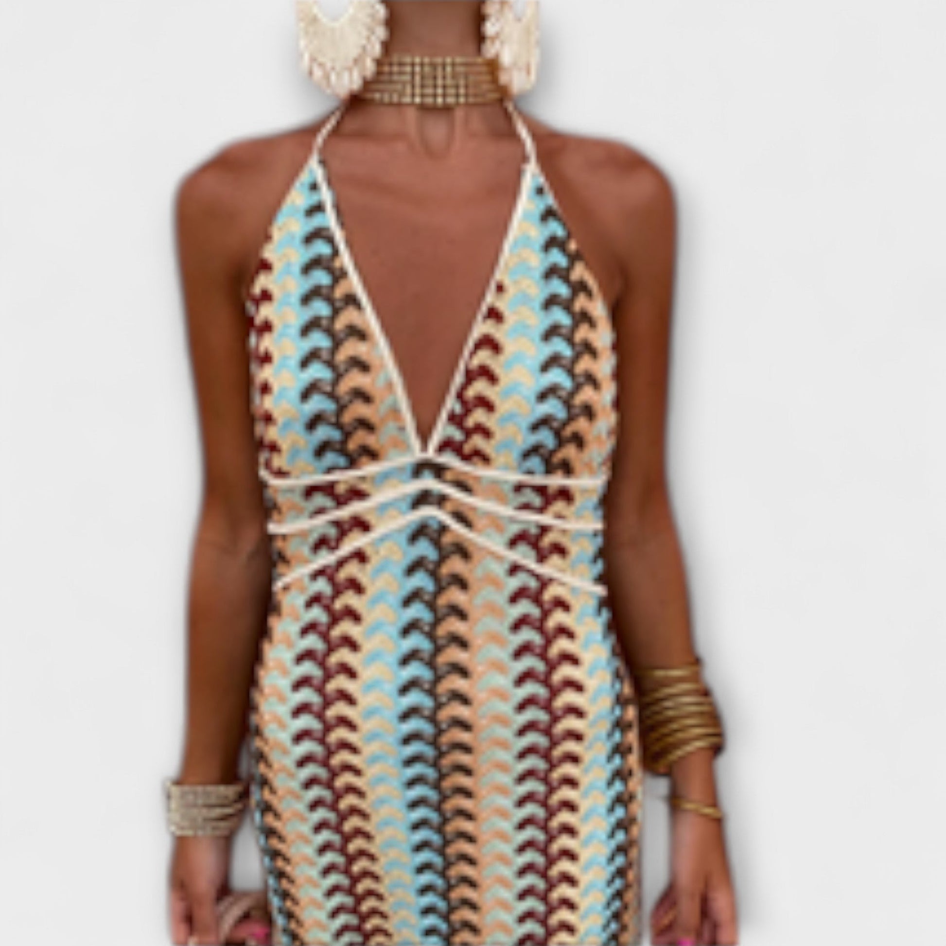 Crafted from soft and lightweight fabric, this dress drapes elegantly, ensuring both comfort and sophistication. The flattering V-neckline and open back design create a chic, effortless look that hugs your figure beautifully.