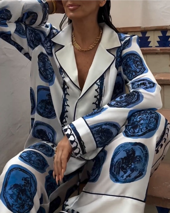✔️ Stylish Design - The two-piece set features a flowing top with a notched collar and straight-cut trousers, creating an elegant and relaxed silhouette.